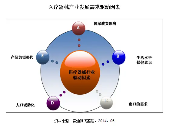 赛迪顾问发布《中国医疗器械产业发展战略研究(2014)》。报告显示,我国医疗器械有着广阔的市场空间,国家政策、经济生活水平和人们保健意识的提高、人口老龄化、产品出口和产品更新换代等因素均对医疗器械产业发展形成较大影响。