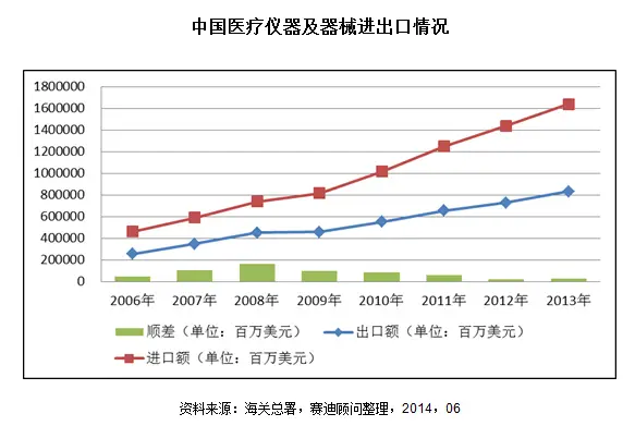 报告数据显示,2013年我国医疗器械贸易总额达343.1亿美元,同比增长14.13%,较2012年增长1个百分点;其中,出口额为193.35亿美元,同比增长9.92%,较2012年下降了2个百分点;进口额为149.75亿美元,同比增长20.07%,较2012年增长5.5个百分点;贸易顺差43.6亿美元,同比下降14.8%。